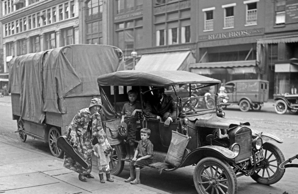Seeger family on the road, 1922. Pete is standing next to his mother.