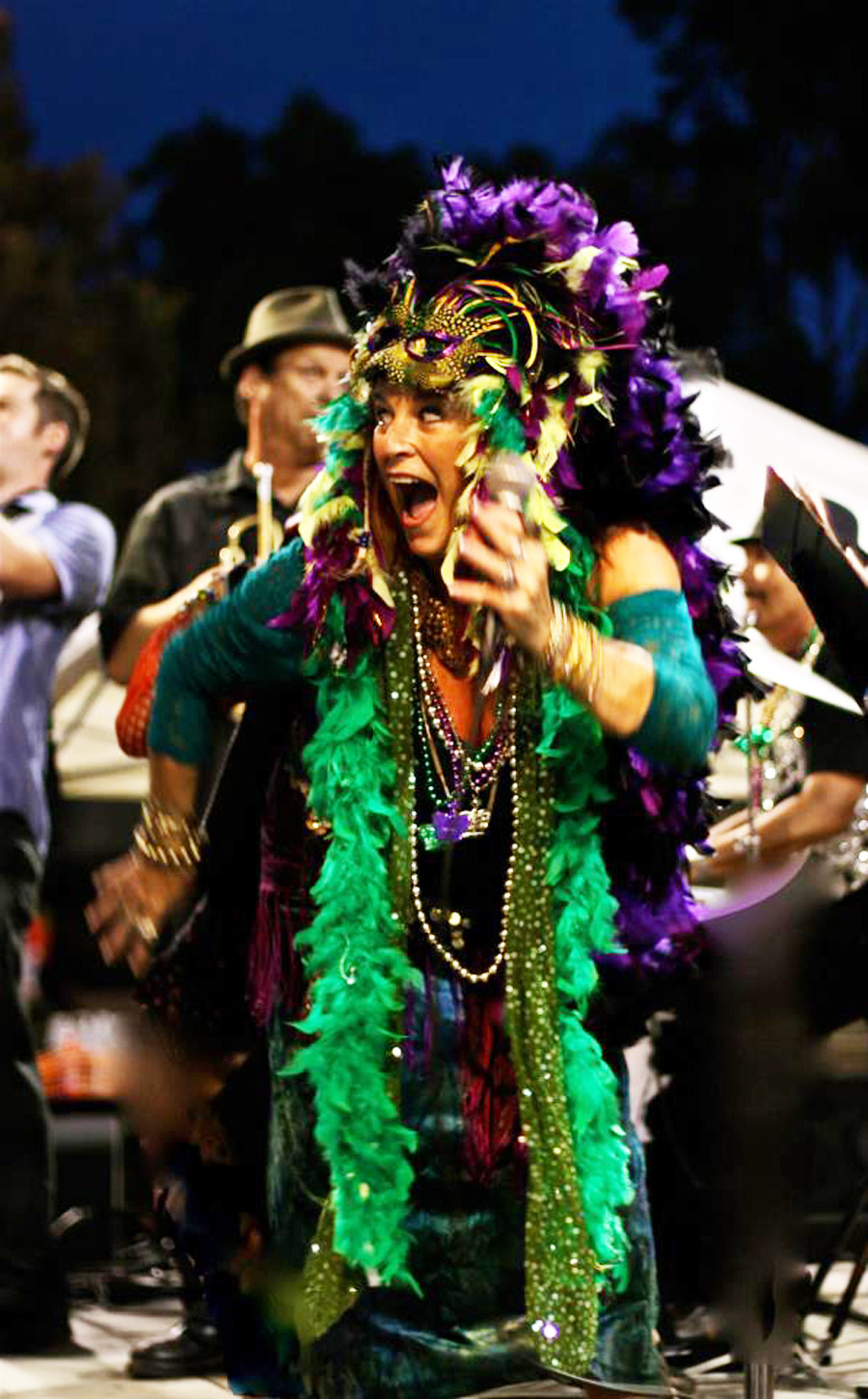 You have an alter ego. Where did the persona, Madame LeRoux, come from? “So, Ric had his Bayou Brothers band but he also played drums in my band. He invited me to play at a Blues in the Schools thing. I made a feathered head dress for a Mardi Gras party so why don’t I dress up and be all voodoo-ish! We did a couple of gigs like that and over time I added more songs, eventually it just became a thing and evolved into Madame LeRoux and Krewe. And I can be somebody else, that other part of me.