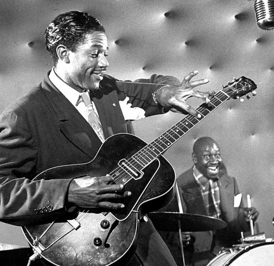 Born in Detroit, Michigan, on the fourth of July in 1911, Slim got into show business in the late ’20s as a solo act, simultaneously playing guitar and tap dancing. In 1937 he teamed up with bassist Slam Stewart to form the Slim & Slam Combo. Their first session for Vocalion Records produced Slim’s long-time hit “Flat Foot Floogie.” They were probably New York’s hottest vocal duo in the years before World War II broke them up.