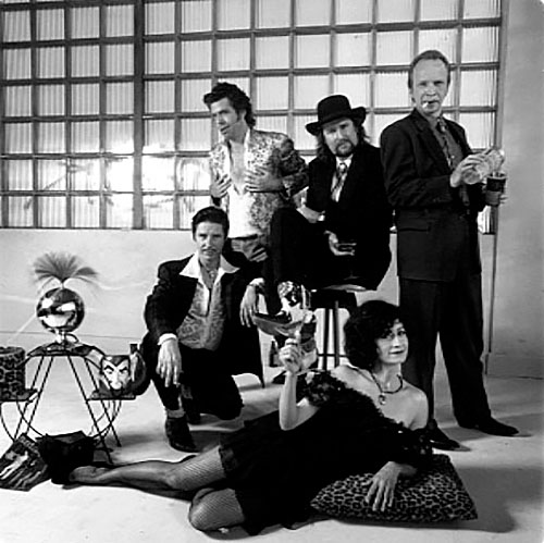 Rosie with the Pleasure Barons, early 1990s. Left to right: John Doe, Mojo Nixon, Country Dick Montana, Dave Alvin, Rosie.
