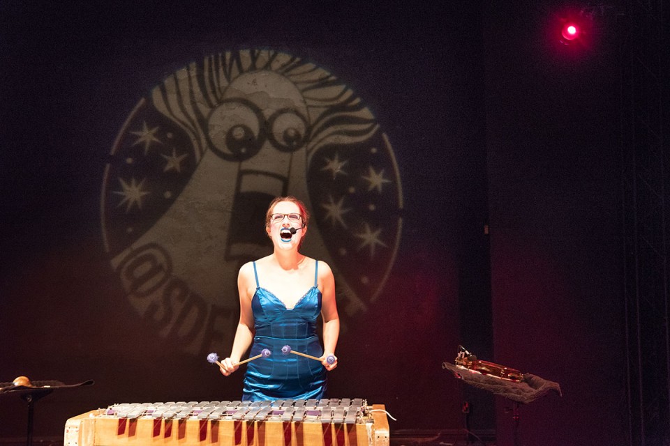 We went through some confusion getting our tickets, and were issued some laminated cards and multicolored lanyards that identified us as Fringe Festival attendees. After some more confusion, we wound up at a very large black door on Fourth Avenue. The door led through a cross between a hallway and an alcove, and we found ourselves in a room with seats facing a vibraphone.