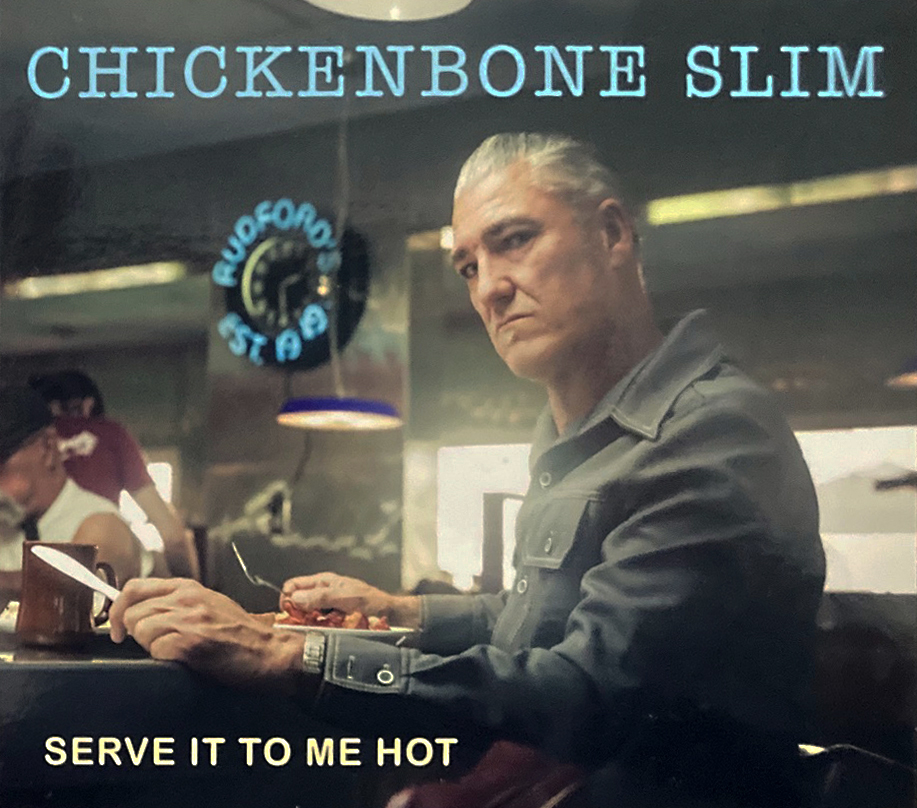 Serve It to Me Hot is Chickenbone Slim’s fourth CD release as guitarist/vocalist/bandleader since his debut CD, Gone, in 2015. It’s a blues lover’s delight throughout the 13 tracks of original tunes, spanning a variety of blues grooves that all showcase Slim’s authentic blues-tinged lead vocals and clever lyrical songwriting sense. He’s complemented by a veteran band nucleus featuring Laura Chavez, lead guitar; Andrew Crane, bass; and Marty Dodson, drums, augmented by a stellar recording job by Christoffer “Kid” Andersen at Greaseland Studios in San Jose, California. Anderson also adds in keys and some additional background vocals along with his wife, Lisa “Lil’ Baby” Andersen on a handful of tracks.
