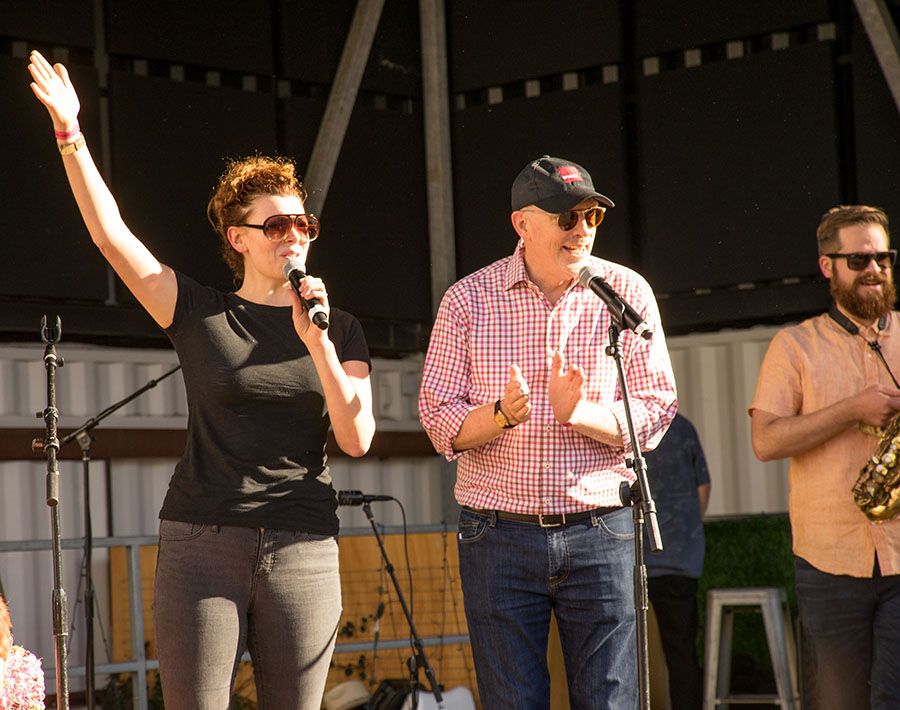 Atkinson announcing the Festival of New Trumpet Music West at the Quartyard w Stephanie Richards, 2019. Photo by Juanita LaHaye.