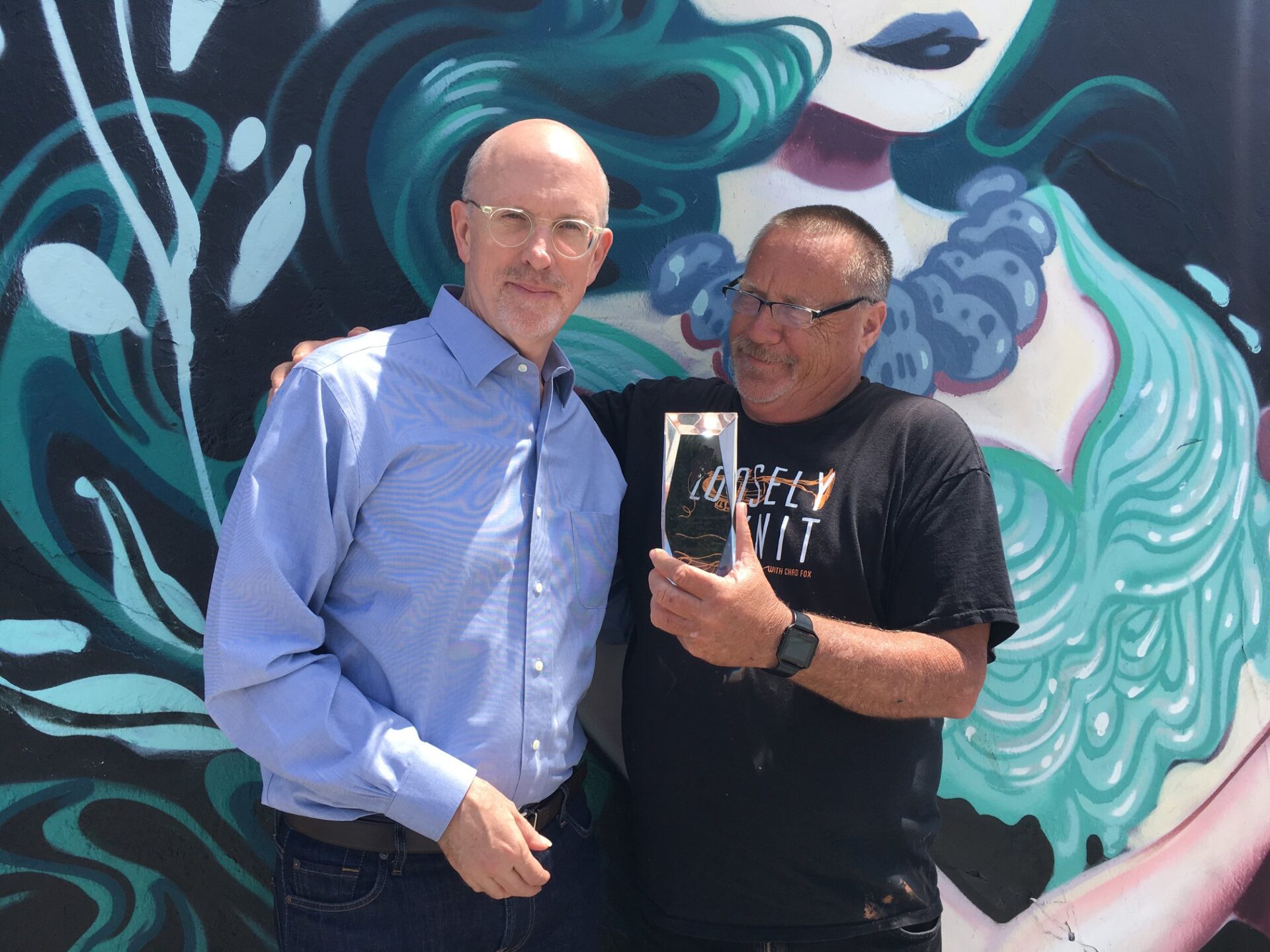 Jazz writer Robert Bush presenting Atkinson with the Jazz Hero Award.