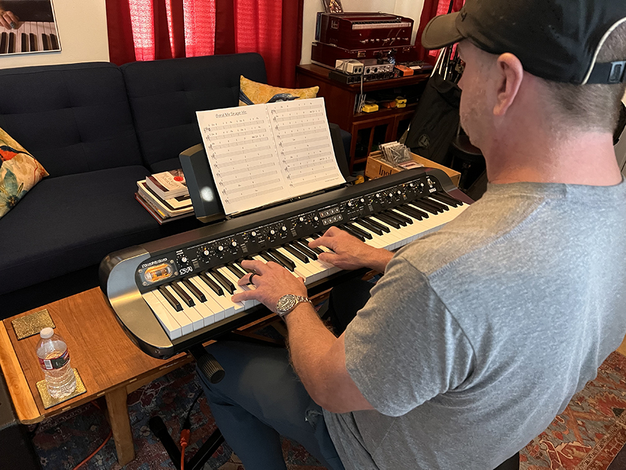 Keyboardist Casey Gee (whom I produced with his band, Crash Carter some years ago) brought his KORG SV-1 (it’s got a bitchin’ little tube in it!) and in one single epic session, he piled bales of raw musical talent through a spectrum of emotive, sensitive, and passionately fiery stylistic turns. He smiled the whole time and so did I!
