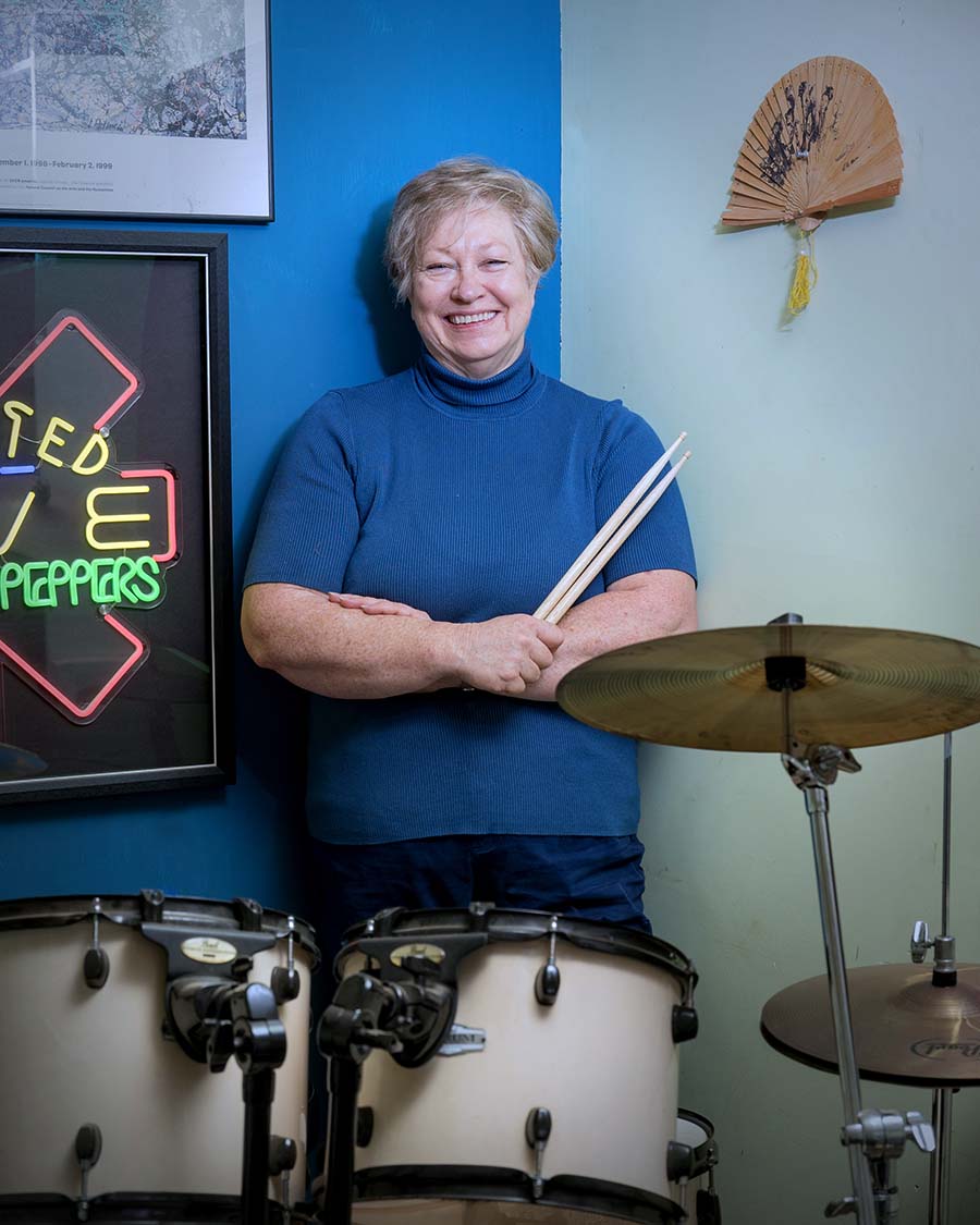 Erin recently turned 60 and just the other year decided to become a drummer. She hadn’t played anything since she played clarinet in marching band in high school, yet her friends agree that she’s already drumming like a pro! (Though Erin confesses she’s having trouble progressing past 150 beats per minute, keep at it, O’Brien!!)