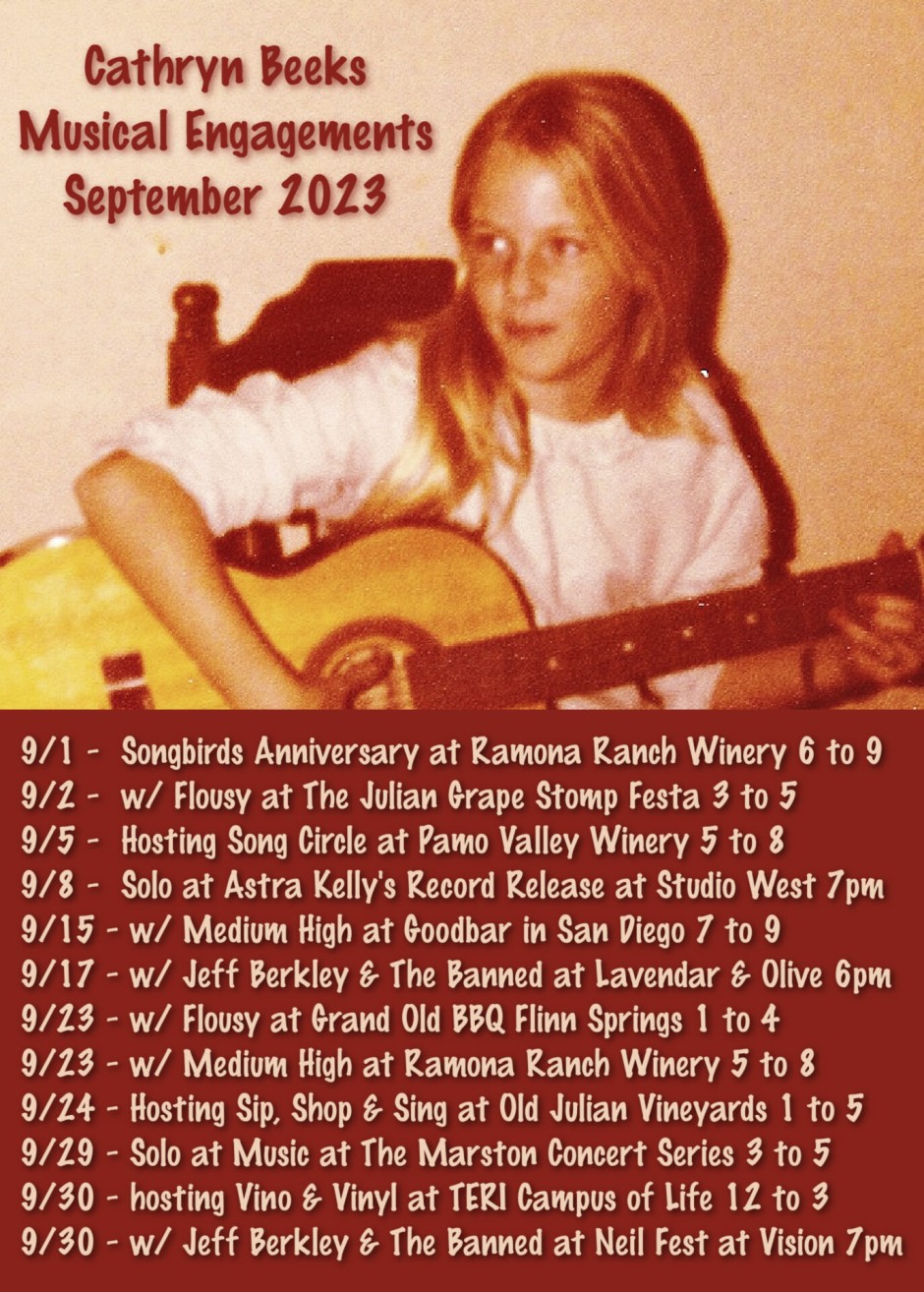 Ok, so that’s it for this month, pals. I’ll leave you with a video I recently made for a song that features the incredible stylings of Dennis Caplinger along with this poster with info about where you can find me in September. Visit CathrynBeeks.com or ListenLocalRadio.com for more details. I hope you’ll join a circle, shop my pop, sing, drink wine and hang out with me. The weather’s gonna get cooler (right?!?) so let’s dig in and celebrate this crazy life. xo Cathryn