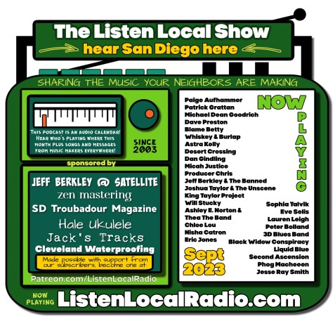 This month’s podcast features music by those performing in the San Diego area in September. After the audio calendar there are songs and messages from makers all over the globe. Please send me your original song and intro message so I can play you on October’s show. Get all the details at www.ListenLocalRadio.com/submitsongs Thanks for listening and thank you to our subscribers for making the show possible.