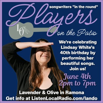 June 4th –Lindsay White turns 40 and over 2 dozen of her pals are singing her songs to her! Join us at the GORGEOUS Lavender & Olive in Ramona from 2pm to 7pm, get all the info here