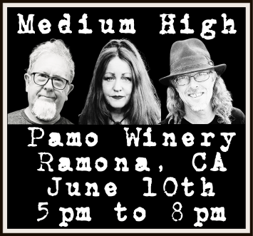 June 10th– The debut of MEDIUM HIGH the new trio featuring the Reverend Stickman, Chuck Roberts and Cathryn Beeks. Covers, originals, fun! Pamo Winery No cover 5pm to 8pm