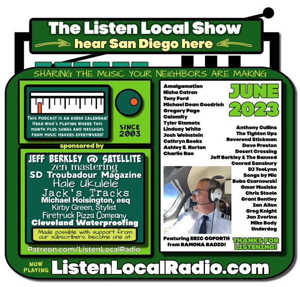 This month’s show features music by those performing in the San Diego area in June as well as my interview with Eric Goforth. The latter half of the show features songs and messages from music makers from around the globe! Thanks for listening and HUGE thanks to our subscribers for making the show possible!