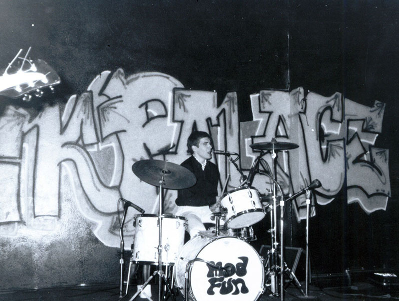 Chris Collins/Mod Fun: We went on tour and ended up playing a great gig at the Rock Palace in San Diego. We’d all recently seen the Three O’ Clock live and I’d even hung out with them in their dressing room at a gig in DC. We were taken with how much makeup they all wore when they were on stage. So, since the Rock Palace was a bigger venue with a lot of stage lighting, we thought we’d try that out ourselves. Unfortunately, we went waaaay over the top –especially me. I think I had some kind of foundation and maybe even eye shadow on in addition to my usual eyeliner. When we started to kick up the energy a few songs into our set and I began to sweat profusely, I really regretted choosing to wear all that makeup. It was dripping into my eyes, getting all over my clothes and generally making it really tough to play—or even see, for that matter. So, at the end of one song when I did a kind of signature flip of my drumstick, I missed catching it and it bounced off the rim of my snare drum and hit me square in the face. Not my most professional moment in front of an audience!
