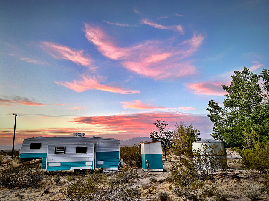 Look south from the property and you face the San Bernadino mountains at 10k-plus feet of elevation. Look north and scan the bowl of Lucerne Valley, ringed by distant rocky hills. The sun does its expected twilight maneuvers to the east and west. The heavens do their dance above, unimpeded by city lights. Cathryn’s CalAmity bandmate Nisha Catron, who knows of what she speaks, says, “It’s amazing walking around the property at night, looking at the stars. Sunrises and sunsets are dreamy.”