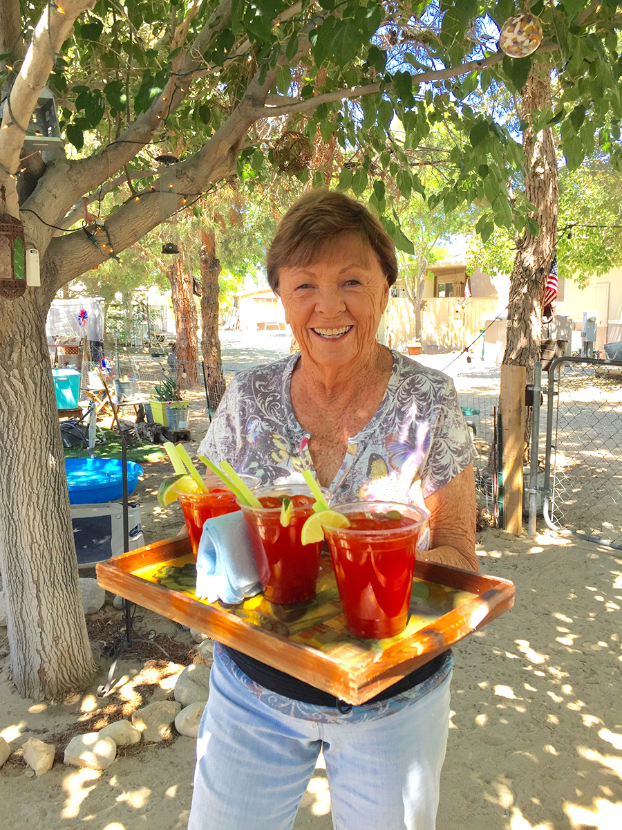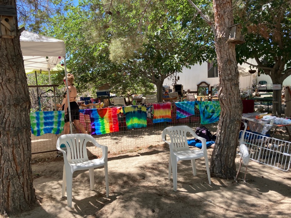 Hart Acres is the newest destination for San Diego musicians wanting to expand their horizons. A couple years back, Cathryn Beeks and her husband, Jon Edwards, answered a family call up into the high desert of the Mojave. It took a lot to achieve escape velocity, breaking out of the orbit of Cathryn’s ongoing musical events and Jon’s live music support career. First envisioned as temporary, it became the solid base for their next launch: Hart Acres. To date, they’ve installed a manufactured home, renovated their old home into a guest house, constructed a first-rate camp toilet and—of course—made a miniature golf course. They hosted their first guests this spring and had their first major campouts in June. Fall season will see activities ramping up. It’s a ramping camp! The Oasis I can’t argue with Cathryn’s knack for branding. (Heck, her band is CalAmity! Her films are made under the ½Fast logo, whose pun only occurred to me as I wrote this article. (Genius often goes unappreciated by the masses!) However, I would have tried hard to work “oasis” into the name somewhere. My visit centered around the Lounge, under a leafy tree canopy, with a cooling breeze filtering through. In hotter weather, there are misters. Rustic art abounds.