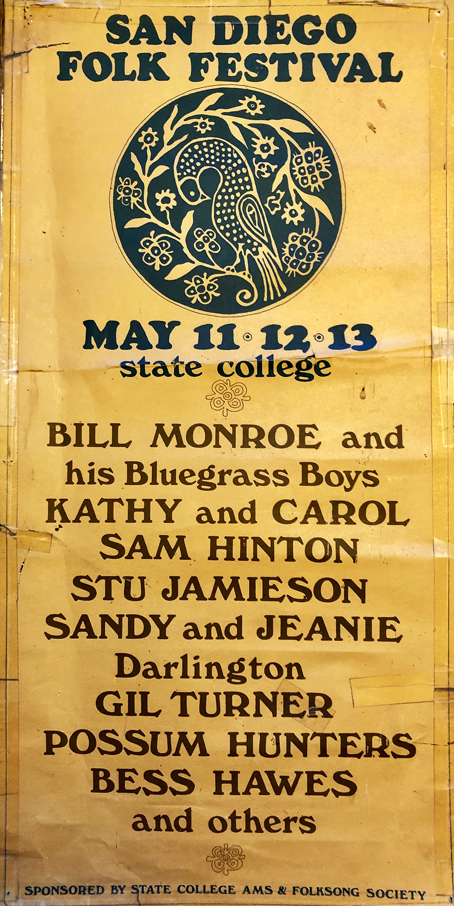 Lou’s story is also the story of the folk music scene in San Diego, beginning in the 1960s. Folk music in America bourgeoned during this period as a cultural outgrowth of the progressive political movement, particularly its coalescing around the Civil Rights movement and opposition to the Vietnam war. As a child, Lou was introduced to both folk music and labor-oriented politics by his father, who was a member of the IWW (International Workers of the World) union and rode the rails during the Great Depression. Lou’s own experiences included registering African-American voters in the deep South and being threatened by the KKK. His social sensibilities, activism, and love of roots music from the South (blues, Cajun, bluegrass, etc.) shaped his lifelong dedication to collecting and disseminating American roots music, mirroring the efforts of Jon Cohen and Alan Lomax.