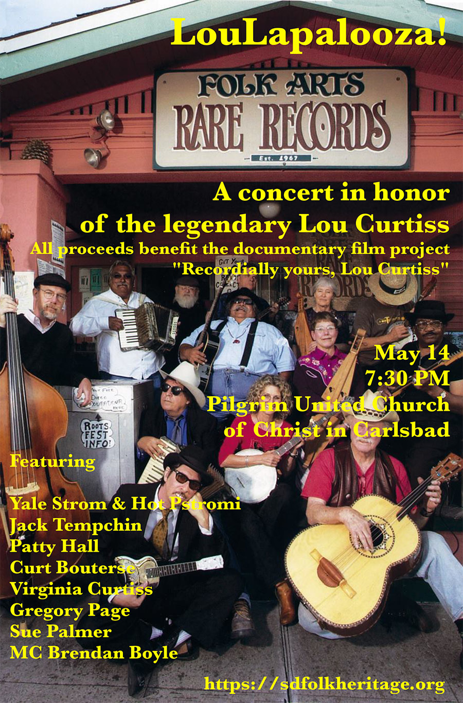 We invite you to be part of the final process. Thanks to San Diego Folk Heritage Society, we are performing a fundraiser concert with Yale Strom & Hot Pstromi—with a sneak peek of the film—on Saturday May 14th, 7:30pm, at Pilgrim United Church of Christ, 2020 Chestnut Avenue in Carlsbad. We’ll also have some very special guests with us: Jack Tempchin, Curt Bouterse, Sue Palmer, Patty Hall, Walt Richards, Virginia Curtiss, and other surprise guests. Let’s welcome the New Year by coming together to honor Lou and his legacy for us and the community. Lou Curtiss Film Benefit | San Diego Folk Heritage (sdfolkheritage.org)