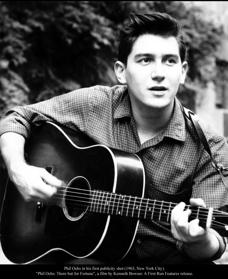 The Revelle Campus Cafeteria at UCSD, 1970, was the first time I became entirely aware of folksinger/anti-war activist and counter culture hero Phil Ochs. He was performing to a full house of hippies, New Left agitators, Marxist professors with a collective lapse of enthusiasm for talk of revolution, rattled undergraduates, and unsmiling advocates for black power and feminism at an anti-war fundraiser, organized by one of the many ad hoc coalitions that attempted to join the far-flung nether regions of the counterculture in common cause. Ochs made a name for himself as the genius pamphleteer among his generation of left-leaning folkies that he was a part of. Considered by the critical mafia to be the heir to Bob Dylan’s protest throne, an easy assumption might be that Dylan ceased writing topical protest in favor of more personal and sort of surreal existentialism in his lyrics. Ochs was a hero of mine, the poet and the wise guy who stirred up audiences with a critical rhyme, a sly smile, a riveting argument you couldn’t ignore.