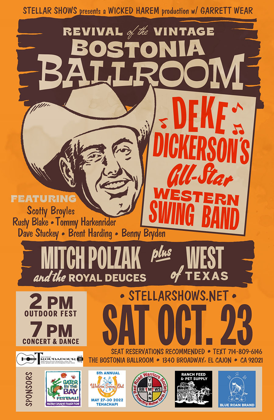 A few months ago, driving down Broadway in El Cajon, Garrett Wear had the vision to bring back the vintage venue that once was the world headquarters for Western Swing: the Bostonia Ballroom, Grand Ole Opry of the Southwest. He shared his idea with producers Christopher Burkhart of Stellar Shows and Rosalea of Wicked Harem Productions. This is what they decided to do to bring it back to life!