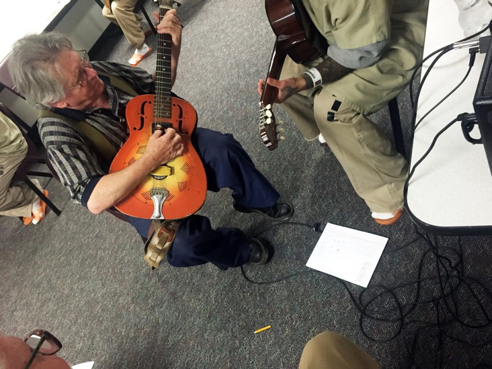 Blues musician Robin Henkel provides instruction (faces blocked to protect inmates’ identity)