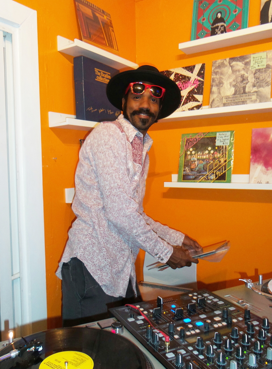 Liz AbbottHoward spinning records at the Vinyl Junkies Record Shack grand opening. Photo by Julia Hall McMahon.