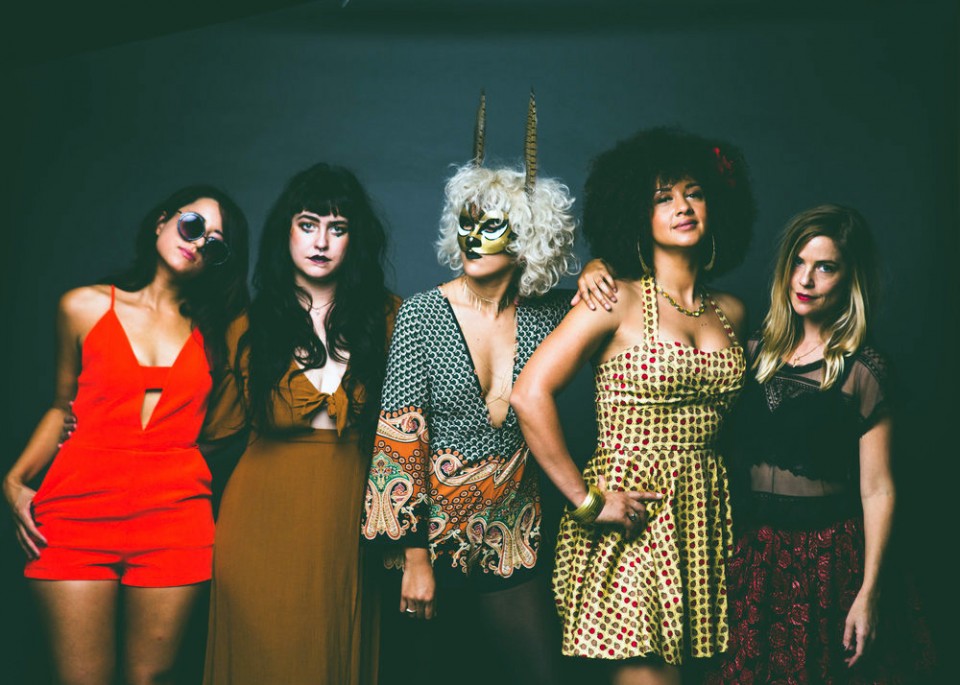 The Redwoods Ladies (l. to r.): Emily Reilly (Birdy Bardot), Shelbi Bennett (the Midnight Pine), Dani Bell, Rebecca Jade (the Cold Fact), and Dawn Mitschele (Cardinal Moon). Photo by Kristy Walker.