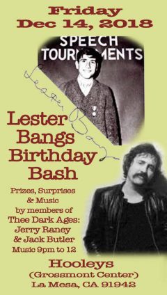 So when in doubt, we can throw Lester a birthday party. After all, this year would mark his 70th. And that’s exactly what’s happening at Hooleys Grossmont Center on Friday, December 14, Lester’s actual birthday: the first annual Lester Bangs Birthday Bash!