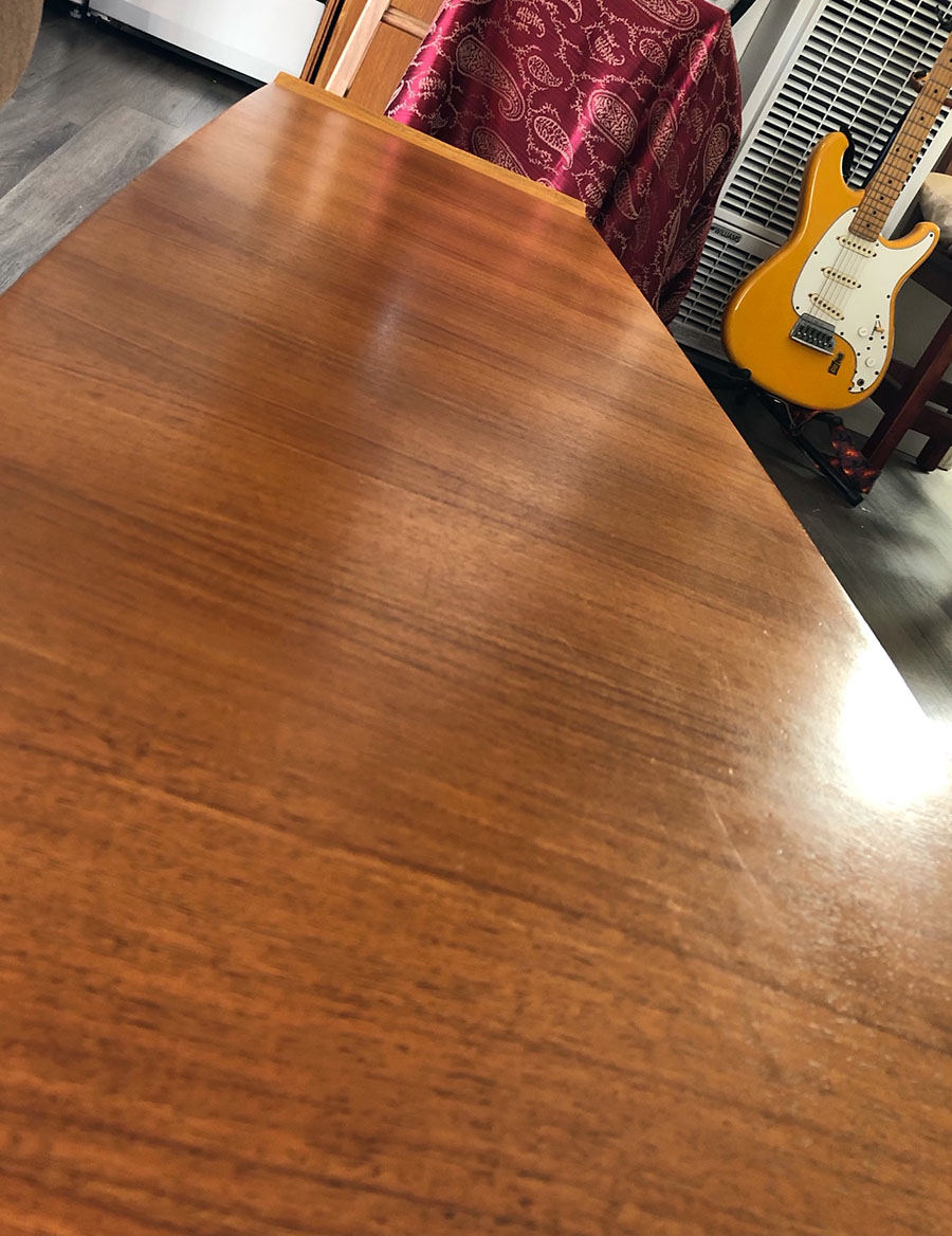 My buddy Wayne Preis spied it through the window of a used furniture store in Pacific Beach some 20 years ago, in some state of disrepair. Peeling and dankly colored from age and neglect, he could nonetheless see the beauty that lay just beneath its worn and shabby surface. He bought it, took it home and spent hours lovingly sanding away the layers of lacquer, scratches and other imperfections. He repaired and expertly refinished it (as he’s done so for many a fine guitar), revealing a beautifully flamed top of indeterminate wood type, nearly six feet long and 19 inches deep. I could also tell you that it is 14 inches high, but you could easily surmise that from a cursory glance at my calico-patterned shins. Also unidentified is the piece’s origin, which so far has only generally been referred to as “possibly ’60s Scandinavian Post-Modern,” a description I incidentally share with it.
