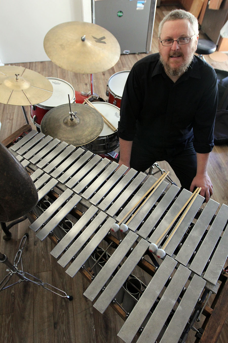 Hubbard also plays orchestral percussion. He was trained in that genre by mentors like Pat Pfiffner at Palomar College and Danlee Mitchell at San Diego State. Most often it’s vibraphone and marimba, with occasionally tympani. All of these skills come in handy when Hubbard works in musical theater around town, a pursuit he engages in several times a year, often for weeks at a time.
