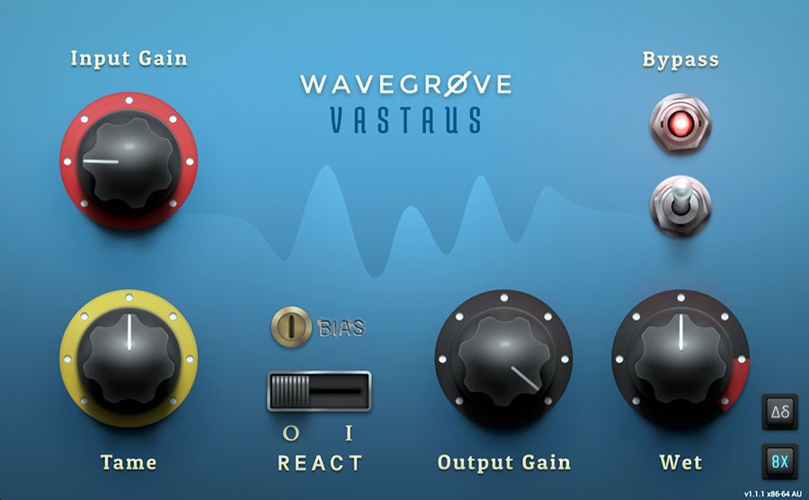 The “React” button lets some of the transients through, resulting in more detail and clarity, but still smooths the sound somewhat. The “Output Gain” and “Wet” knobs finish blending the effected signal with the original in whatever way you’d like.