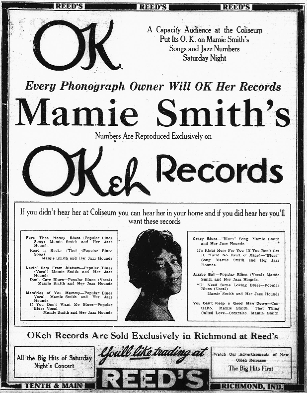 Black history on record started with orchestral and gospel music by groups like the Fisk Jubilee Singers, Jim Europe’s Military Band, and vaudevillians like Bert Williams, but black jazz started with Mamie Smith’s Okeh 4169 “Crazy Blues”/“It’s Right Here for You.” Both songs were described on the label as “Popular Blue Song”; the time was November 1920. The record sold pretty well and it became apparent to the record companies that there was a heretofore untapped market—the black record-buying public forming about 10% of the total population. Within a year three major record companies—Okeh, Paramount, and Columbia—started black music sections advertised as “race records.” A fourth major company, Victor Records, entered the market in 1924.
