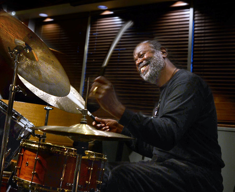 Stewart’s facility with his left hand also impressed Lytle, who explained that was unusual for West Coast drummers. “Ronnie reminded me of all of the New York drummers of all eras whose left-hand activity plays an important role in commentary and drive,” Lytle said. “Ronnie was the first California drummer I ever heard who could push and inspire a band.” That’s a powerful endorsement coming from Lytle, now a professor emeritus at UCSD. A secret to Stewart’s proclivity is that he is, in fact, left-handed. He learned to play the traps array set up for a right-hander. Unlike many left-handed drummers, he did not move the high-hat and snare drum from the left side to the right side of the kit.