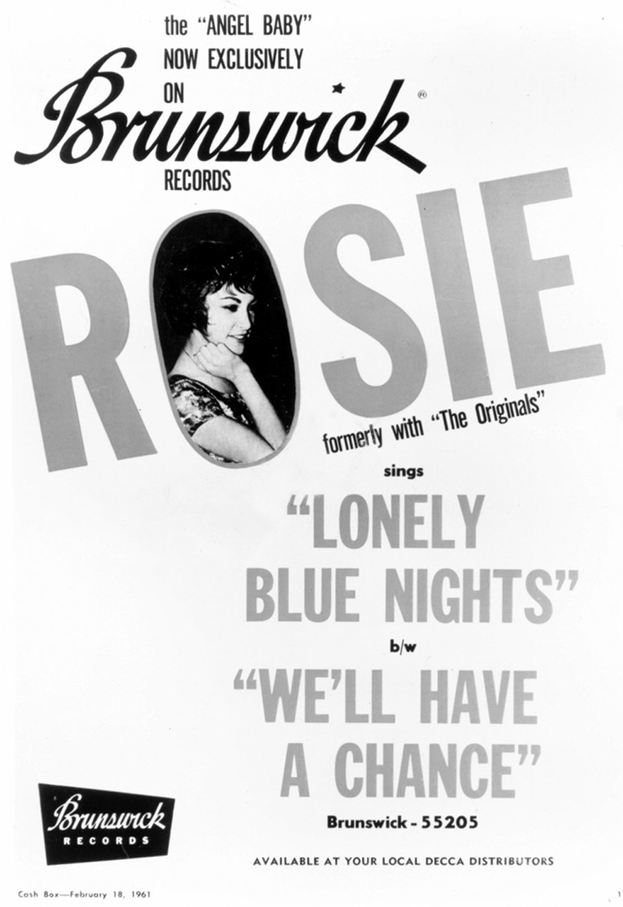 In March 1961 Rosie made a record for the Brunswick label after impressing Wilson. The A side was titled “Lonely Blue Nights” and despite an appearance on American Bandstand in February 1961, it unfortunately didn’t come close to achieving the success of “Angel Baby.” Another aspect of the Brunswick contract stipulated that she would be managed by Wilson’s agent, Nat Taranpol. Considering Jackie was voted Entertainer of the Year for 1960-61 by Cashbox, it seemed that Rosie would have continued career advancement under her new management. She made one more single for the label that same year, “My Darling Forever,” and followed it up with an album, which met with little chart success.