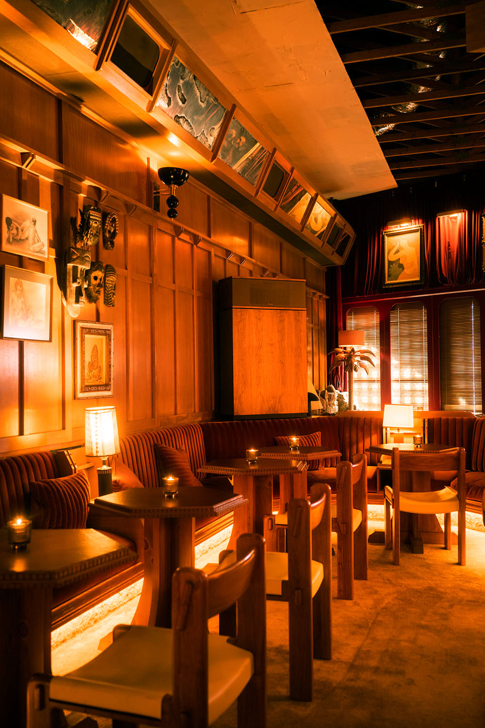 In contrast to the urban smell of wet pavement and cigarette smoke outside, the bar feels like a step back in time. Incense mingles with a faint whiff of someone’s perfume. Polished wood gleams in soft candlelight; glowing bottles of liquor framed in spherical cutouts behind the bar evoke a high-toned place where a Philip Marlowe or Sam Spade might belly up for a double shot of scotch before following some dame to the cozy sofas in the back of the bar. Lining the walls are cushioned benches studded with tasteful, comfy pillows. Cabaret tables placed at intervals along the benches makes the seating flexible; if you’re lucky and get there early in the evening, you might score a cool velvet banquette at the front of the club, or maybe even a stool next to the turntable. Classy joint, right? Sure, but then you see an Awkward Family Photo in a gilded frame hung like high art on the wall. Tribal masks stare at you from above the wall benches. And in the hallway to the bathroom? The coolest pink elephant wallpaper, if there is such a thing.