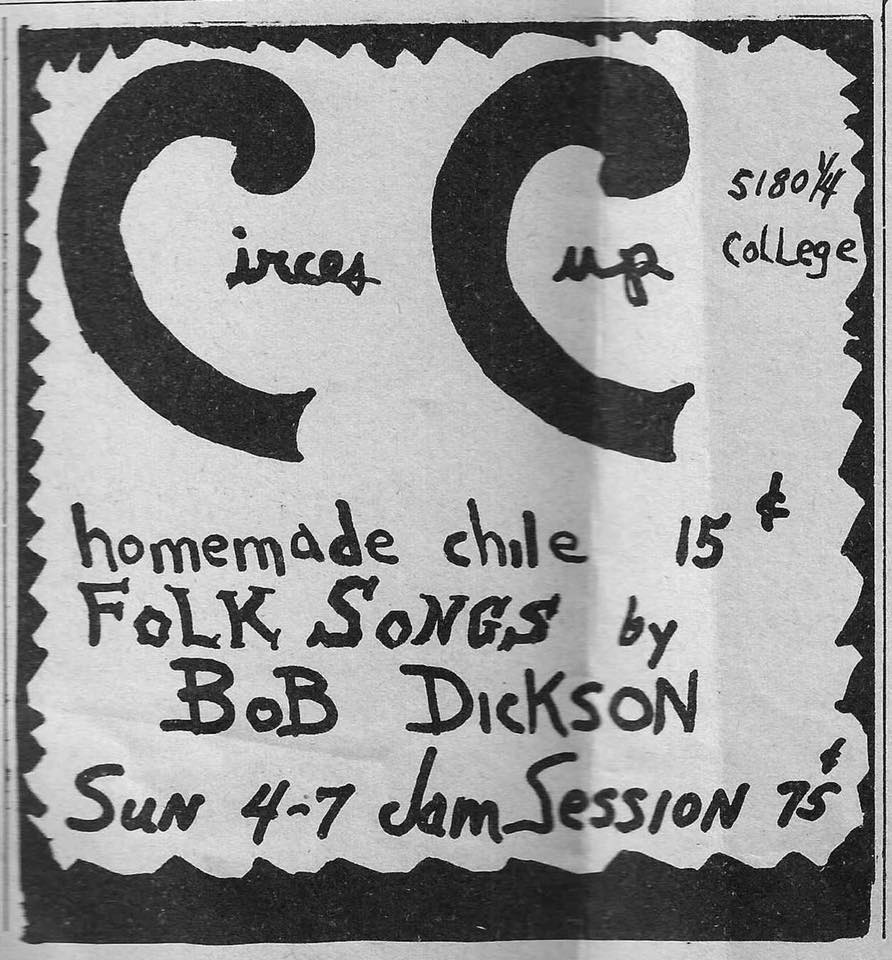 About the same time a bunch of San Diego State students opened a place called La Parise just a few steps from the SDSU campus. Inside the walls were covered with murals of the interior of a French bordello, and all the faces of the many characters were those of the then students and professors at San Diego State. Not long after the place opened, the ownership changed and the name changed to Circe’s Cup, but the interior murals stayed. The Ivory Tower Jazz Quartet played there regularly and that’s where I saw Josh White, Juanita Hall, and several well-known out of towners. The era of the Great Folk Scare was in full swing. The owner of Circe’s Cup was a guy named Butch Miller, who kept it open for three or four years before eventually drifting on. After that it became a pool hall (called Circe’s Cue—they only had to change part of the sign), then a sandwich shop (with all the murals painted over in a dull flat white), and now the building isn’t even there any more since the university has taken over the whole area. Many people who remember the Cup also remember the cheap apartments upstairs, which you had to turn sideways to get in to. Bookcase, bed, hot plate, and not much else. Living upstairs at the Cup was always bohemian student life at its worst but then downstairs there was some mighty good music.