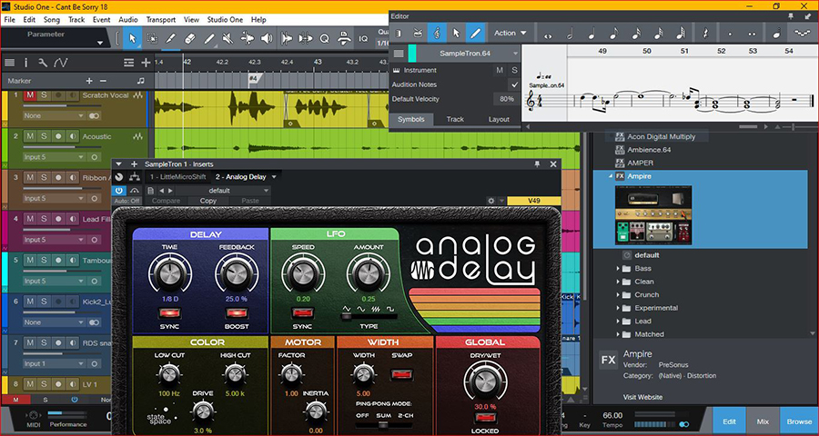 In fact, version 5.1.1 does some great things to guitars and other instruments via its longtime amp simulation plugin, Ampire. For instance, along with being able to dial in your desired guitar tone by running through your choice of amp, be it a Marshall, Fender, Vox, or Rectifier style, along with a complimentary (or not) speaker cabinet choice, you can also add some really well-done emulations of pedal effects. I own a Boss Chorus, an Ibanez Tube Screamer, and an MXR Phase 90 and I can tell you: they’re currently collecting dust, because PreSonus’ software versions of these and a host of other stomp boxes are so damn good; and you can drag and drop these all you want!