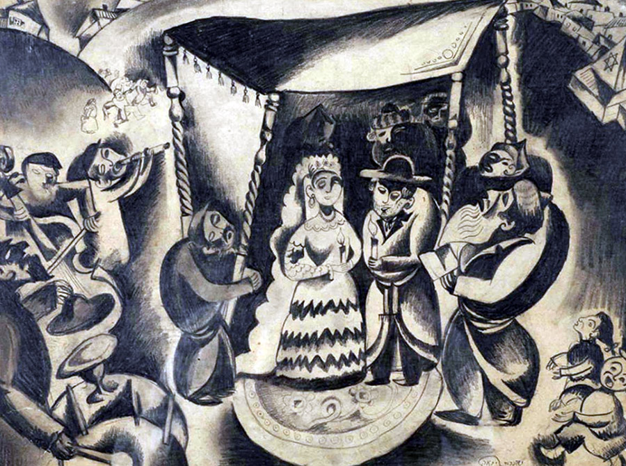 Klezmer is associated with celebratory occasions, particularly weddings, and is known for its danceable beats and imporvisational style. Illustration by Issachar Ber Ryback, 1917.