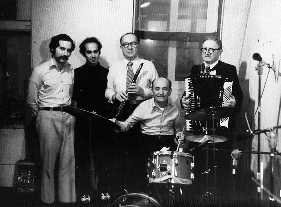 Tarras (ca. 1976) with bandmates Irving Graetz (drums) and Sammy Beckerman (accordion), along with musicians Zev Feldman (left) and Andy Statman (right). Efforts by Feldman and Statman to promote Tarras’ music helped spur a klezmer revival in the 1970s. Photo courtesy of Yale Strom.