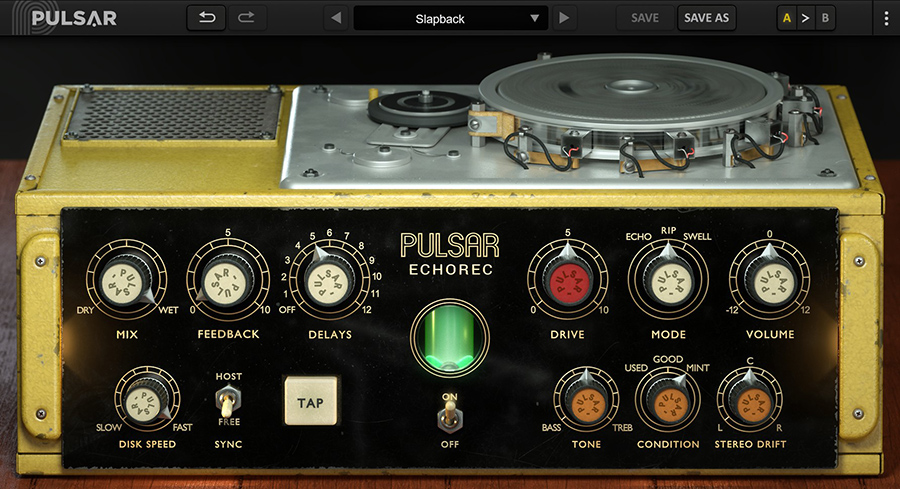 In developing the Echorec, the engineers at Pulsar listened to several of these increasingly rare units and ultimately “modeled the Echorec in three states of wear,” which can be selected by the Condition knob: Mint is a faithfully maintained unit in excellent condition, while Good is a slightly used one. Used has worn out tubes and its magnetic heads are a bit out of adjustment. I can’t express enough how creatively useful the inclusion of these three states of wear are, other than to say I’ve used them all, several times over.